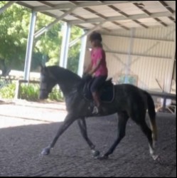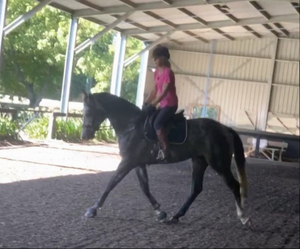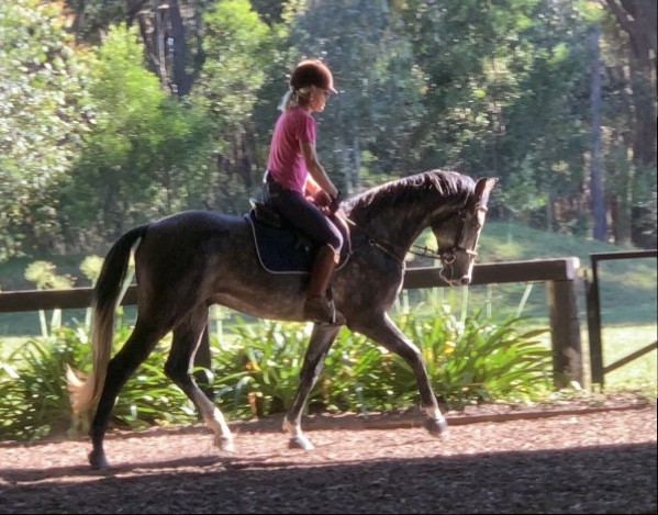 Visage at the AWHA Dressage competition at SIEC, July 2016, with one of his children watching in the background.